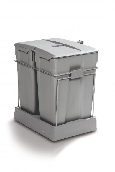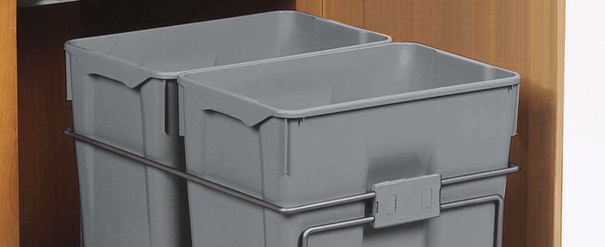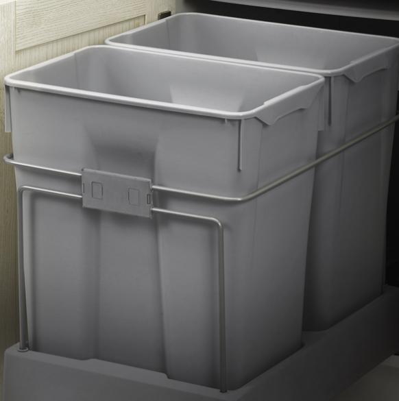 Pull-out waste bin fixed to the bottom of the cabinet and equipped with automatic lid.
