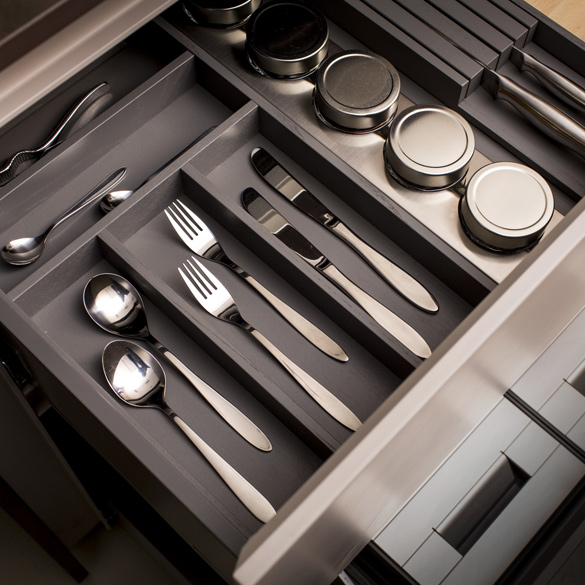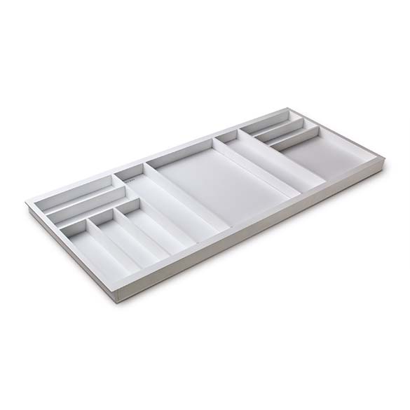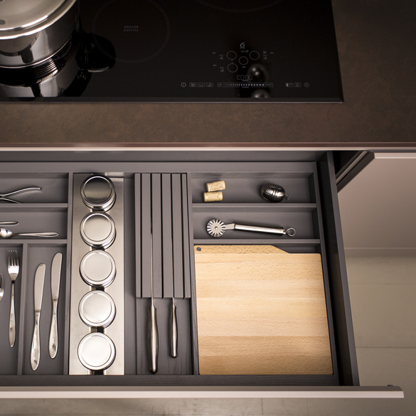 Première Collection cutlery trays are made of ash wood with open-pore finish. Each cutlery tray is equippable with dividers to simplify the storage and additional accessories such as chopping board, knife holder and film dispenser.