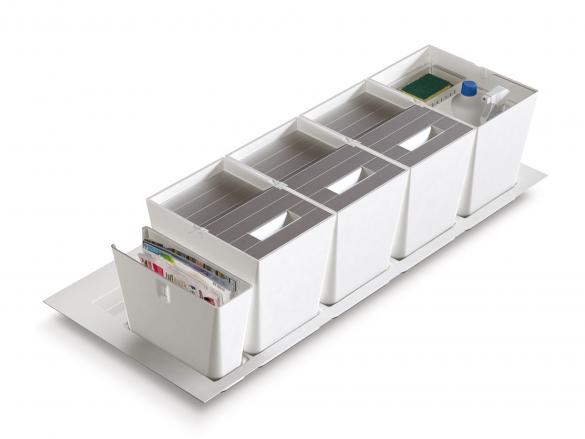 The tray hosting the bins can be cut to size and stainless steel depth compensators for greater depths are also available.