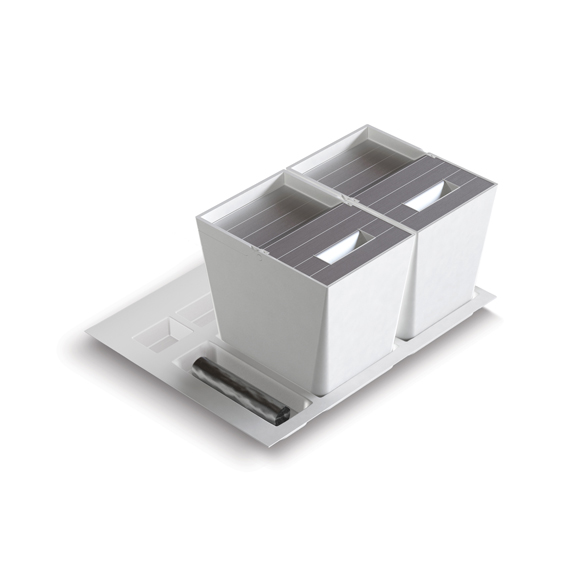 Waste bins for large drawer with matt finish plastic lids.