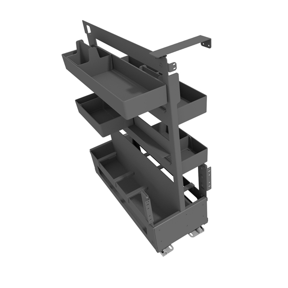 Sous-Chef is the latest innovative solution from Gollinucci designed to organize internal kitchen spaces. Equipped with adjustable compartments, the product allows for easy access for all cooking ingredients, accessories and cutlery. In addition to orion grey, the product is also available with a knife holder (in walnut finish), and can be used in cabinets from 150mm-600mm. The product is suitable both for cabinets with standard doors and for the most common types of drawer (Blum®, Grass®, Hettich®, FGV®…).