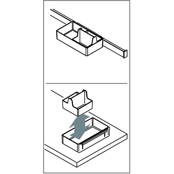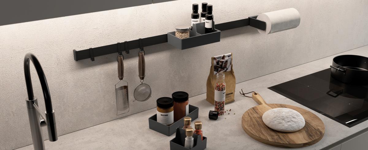 La collection Sous-Chef est enrichie d’un nouveau système conçu pour accessoiriser au mieux les parois de l’espace de travail dans la cuisine, en libérant ainsi de le plan de travail. Sous-Chef Rail System se compose d’une barre en aluminium anodisé équipé de pratiques crochets multiusages. Les bacs inclus dans tout produit de la collection Sous-Chef peuvent être accrochés sur la barre pour organiser et personnaliser au mieux les espaces de travail. Des bacs additionnels avec un porte-épice amovible et un porte-rouleau, également à détacher et à utiliser sur les étages de la cuisine grâce à son appui vertical, sont disponibles en option. La forme élégante et minimaliste de l’élément vertical ainsi que des crochets en métal rendent le produit adapte à tout type de cuisine. Disponible en dimension 600/900/1200mm.
