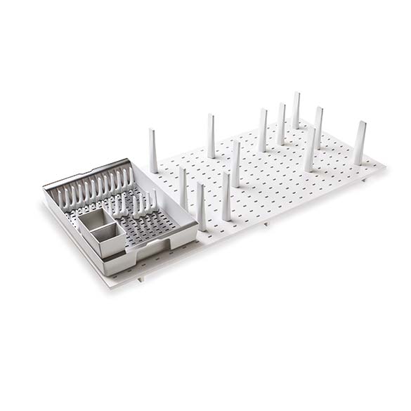 Art. 1210: range-assiettes et égouttoir pour grand tiroir avec base en bois perforé et plateau égouttoir en acier inox.