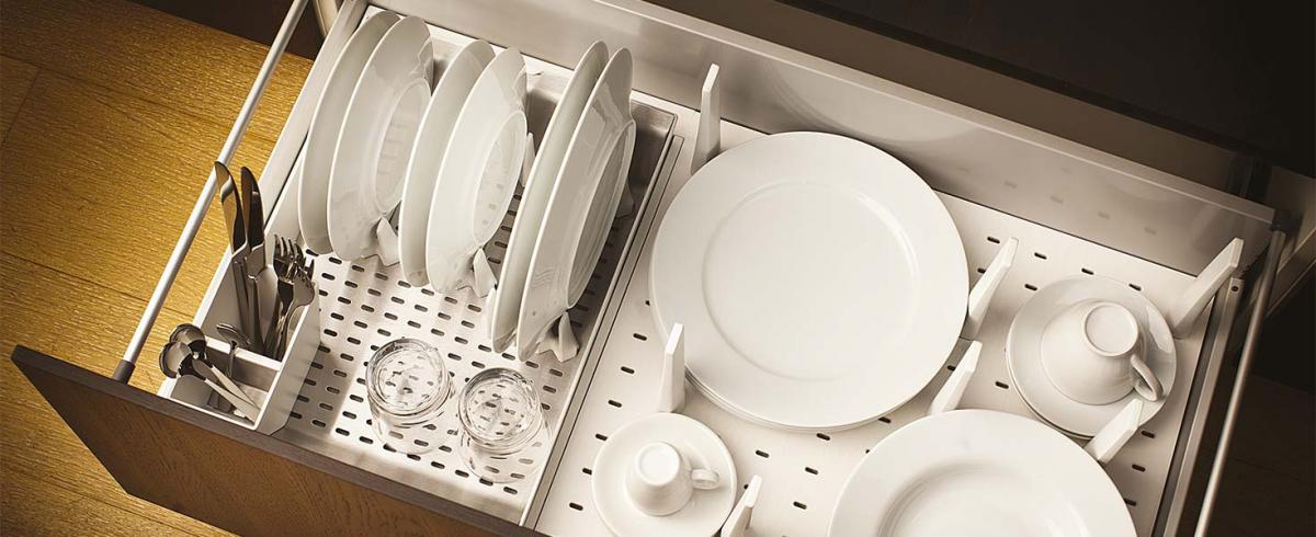 Conçue pour répondre au besoin de ranger avec ordre la vaisselle à l'intérieur du grand tiroir, la ligne de range-assiettes Première propose un produit composé par une base en bois range-assiettes et un plateau-égouttoir.