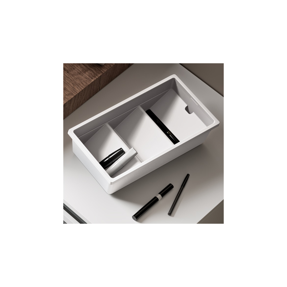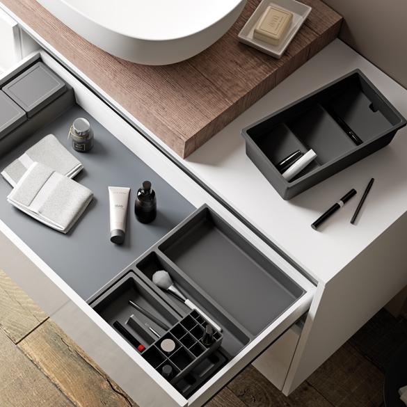 Gli accessori per cassetto della Linea ONDA sono ideali per organizzare al meglio i cassetti del mobile bagno.
